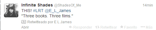 Parece que los rumores no dejan de girar en torno a tan mencionada adaptación cinematográfica, y últimamente se ha escuchado bastante que los tres libros se convertirían en una sola película, lo que al perecer fue solo un rumor de mal gusto para todos los seguidores de la historia entre Anastasia y Christian, pues varias cuentas oficiales sobre 50 sombras e incluso la misma autora aseguran que serán tres películas respectivas a los libros, solo queda seguir esperando noticias y estar al pendiente sobre lo que es un hecho y lo que es solo un RUMOR…